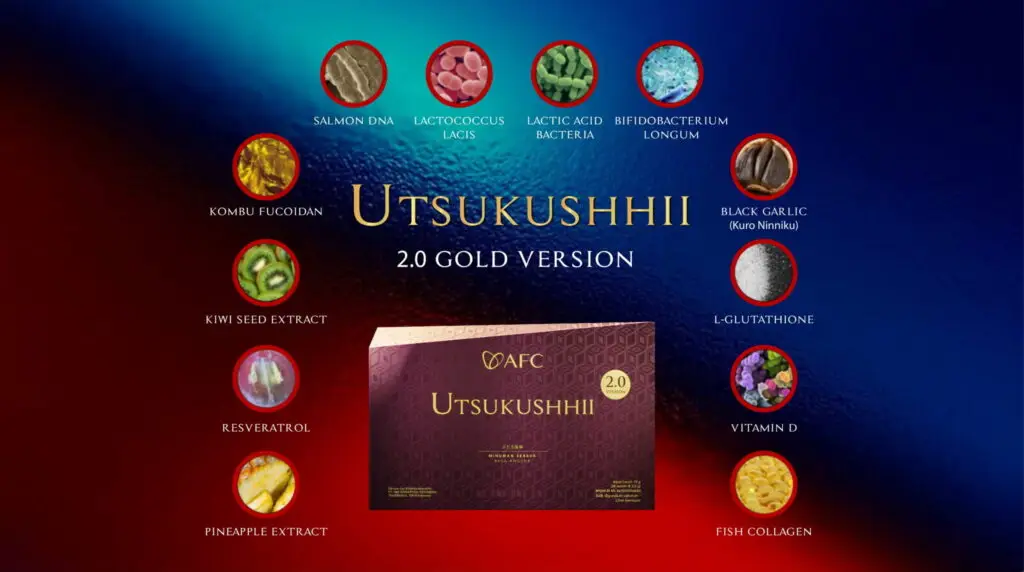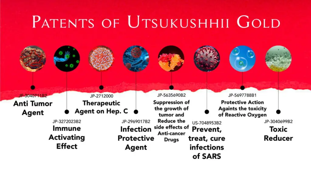 Utsukushhii Gold adalah suplemen imun berkualitas tinggi yang dirancang untuk meningkatkan daya tahan tubuh. Serta memiliki patent fungsi anti tumor agent, dan 7 patent lainnya.